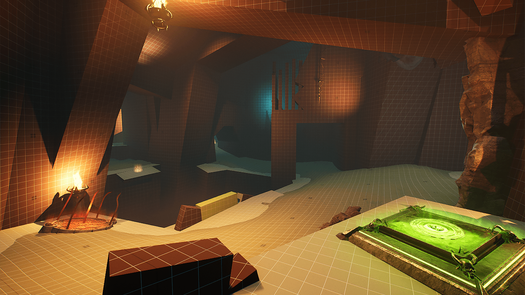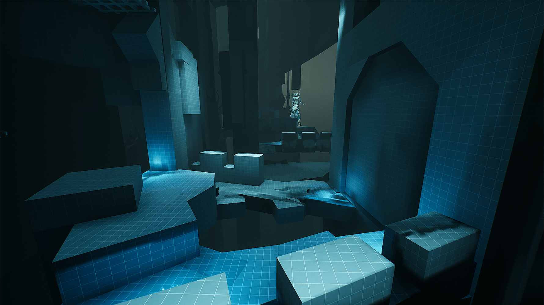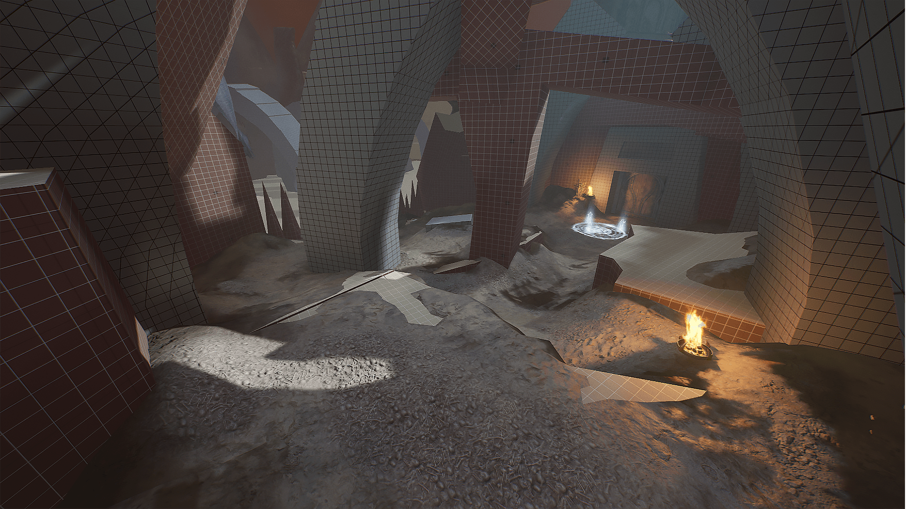 A small combat arena, partially symmetrical, with a statue in the middle that we can knock over to form a path into the Solitude Valley.