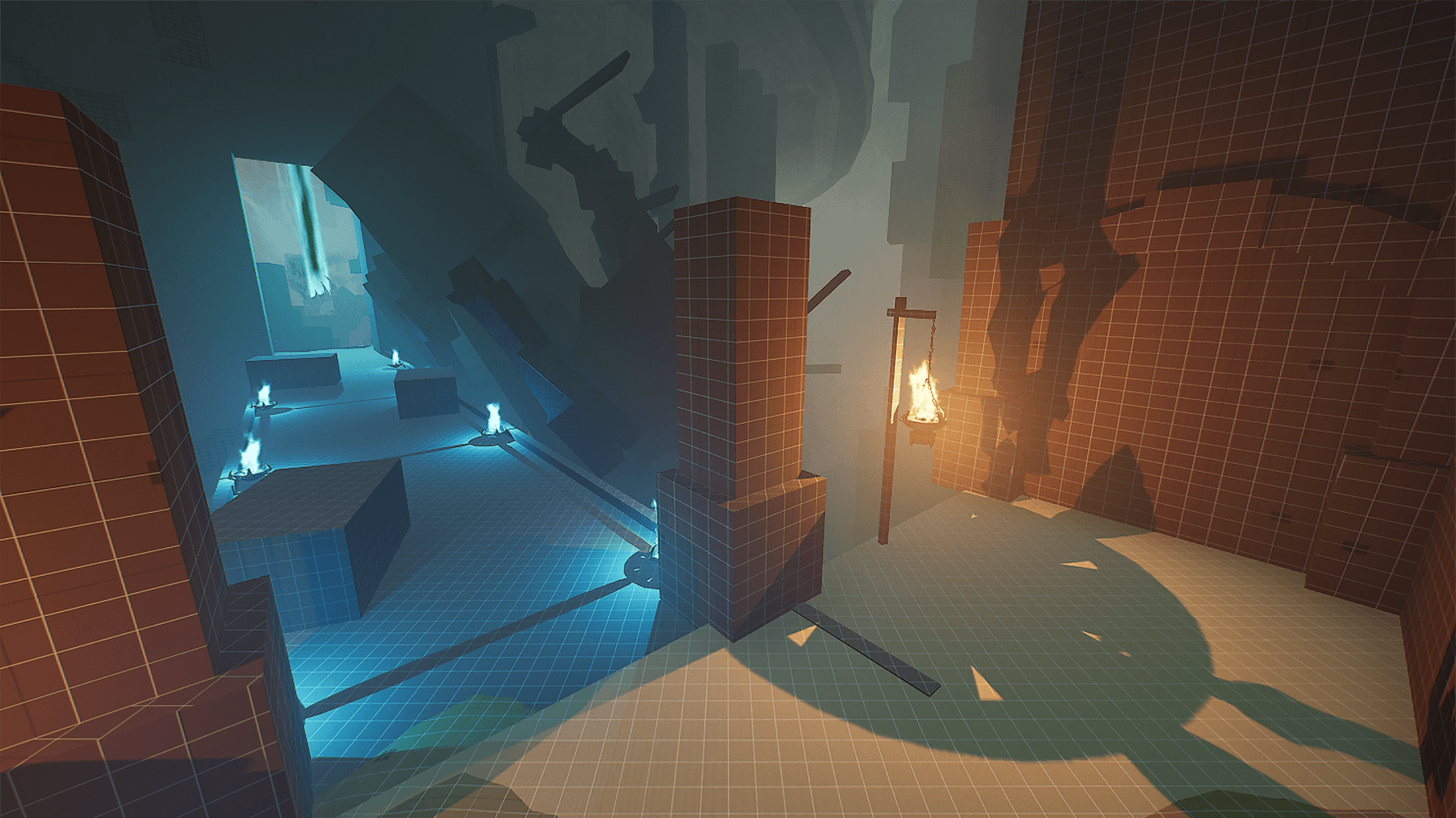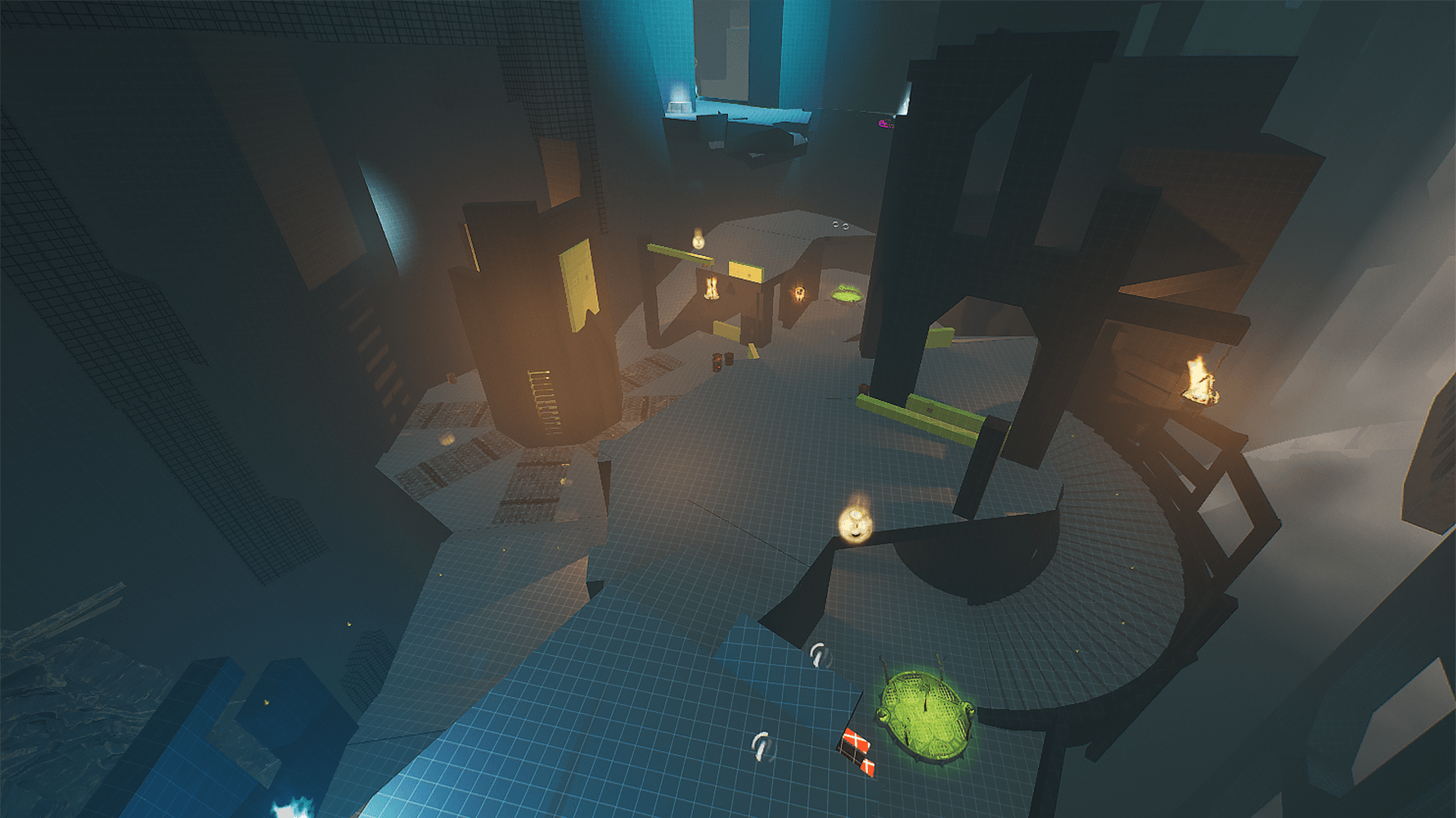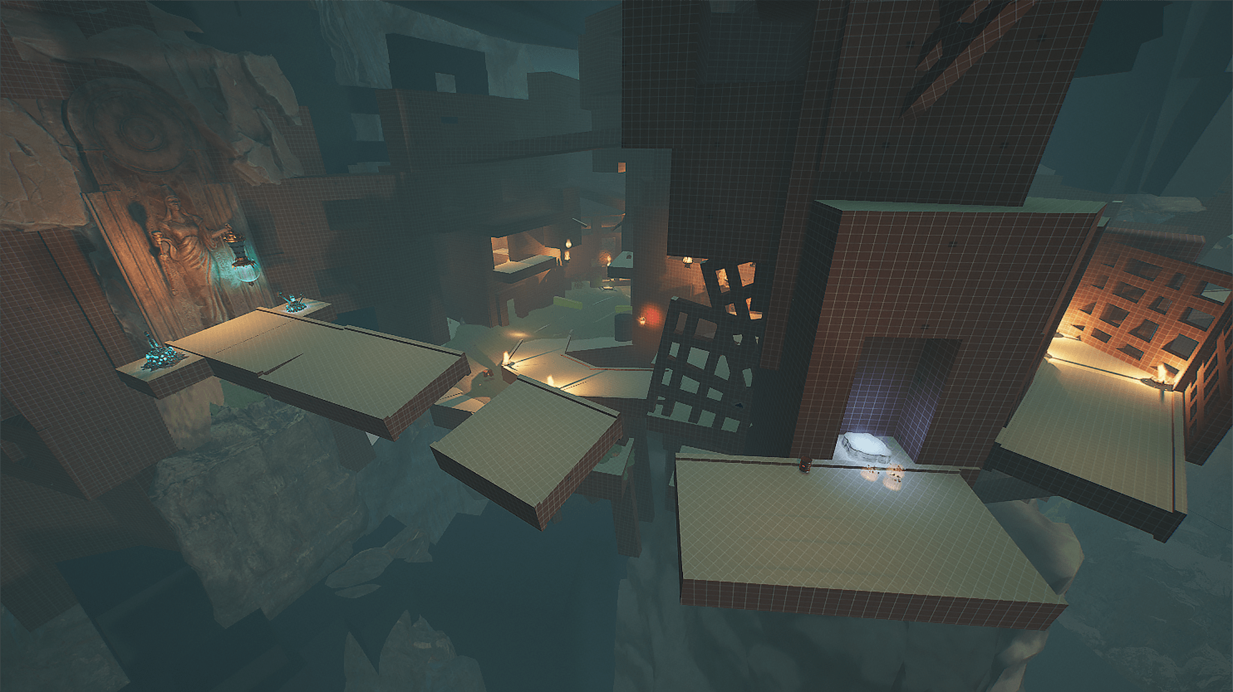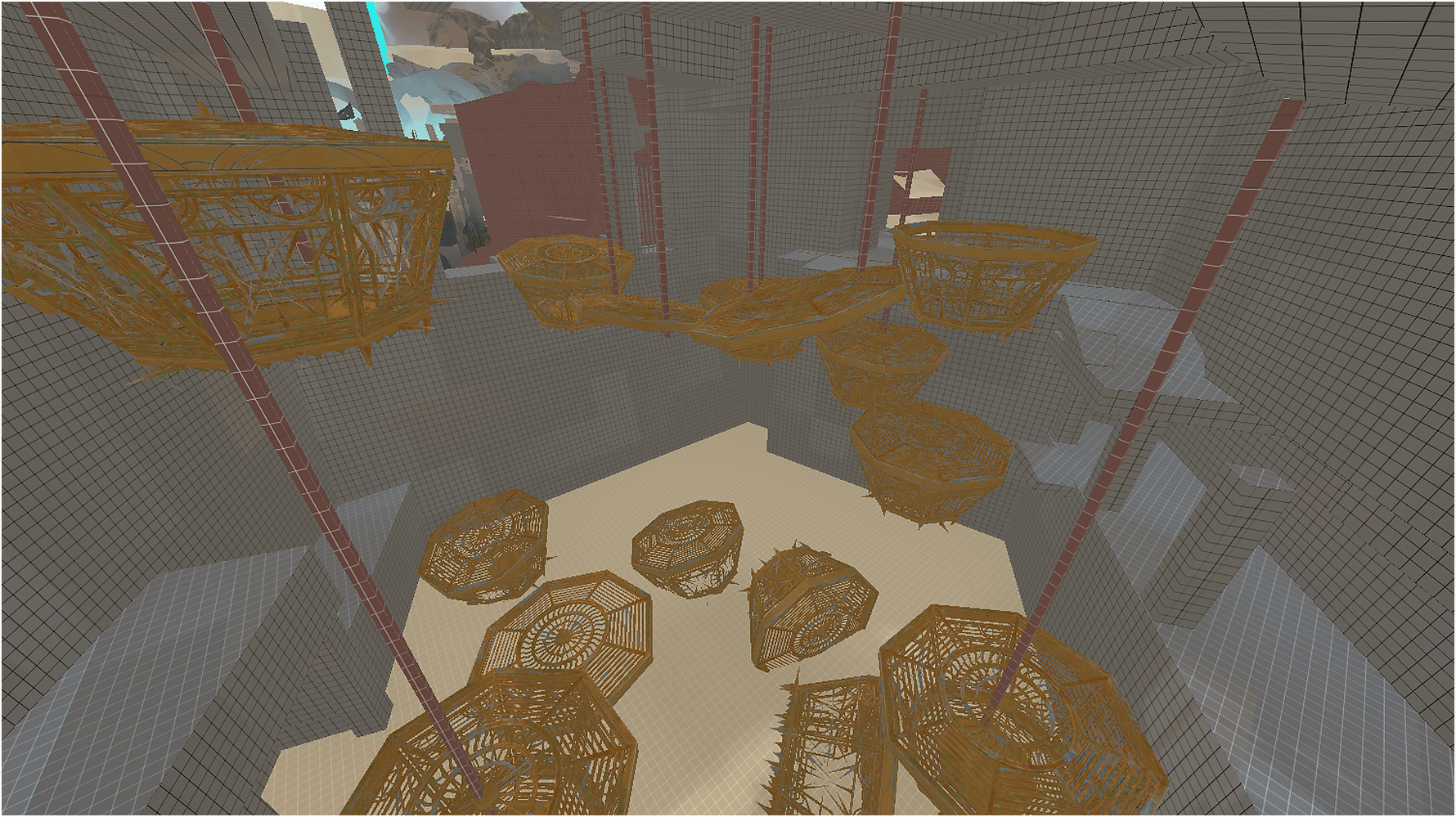 Exploration Space, where players must reach the other side of the tower. A vertical space where players must climb cages. After emerging, overlooking the temple, players can solve a cooperative puzzle to obtain treasure or proceed directly to the next arena.